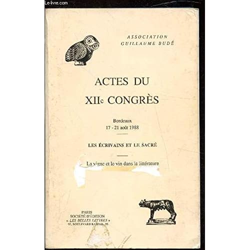 Actes du XIIe Congrès - (Bordeaux 17-21 Août 1988) - Les écrivains et le sacré - La vigne et le vin dans la littérature - 1ère partie - Rapports et conférences
