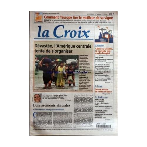 COMMENT L'EUROPE TIRE LE MEILLEUR DE SA VIGNE - ENQUETE - SI LES VINS FRAN-œAIS DEMEURENT RENOMMES ILS NE SONT PAS LES SEULS EXEMPLE - EN ALLEMAGNE DE JEUNES VITICULTEURS DEVELOPPENT UNE NOUVELLE APPROCHE PLUS EXIGEANTE - DEVASTEE L'AMERIQUE CENTRALE TENTE DE S'ORGANISER - REPORTAGE - SOLIDARITE - OPPOSITION CHARLES MILTON TIENT SAMEDI LE CONGRES FONDATEUR DE SON MOUVEMENT LA DROITE - DURCISSEMENTS ABSURDES - L'EDITORIAL DE FRANCOIS ERNENWEIN - L'ACTUALITE - CABLE OU SATELLITE LA NOUVELLE TELE MODE D'EMPLOI - TROIS GEANTS DE L'INDUSTRIE EUROPEENNE SE RESTRUCTURENT - LES ELEVEURS DE PORCS DE CHEMERE CULTIVENT L'ANTI-MODELE BRETON - LES EVEQUES CHERCHENT A AMELIORER LEUR COMMUNICATION - LE TOUR DE FRANCE 1999 MISE SUR LA MORALE - LE FORUM - QUATRE LECTURES DE FIES ET RATIO - LES RENDEZ-VOUS - INITIATIVES - LE P JAOUEN ET SON BEL ESPOIR PRETS POUR LA ROUTE DU RHUM - COMMUNAUTES - LES CENTRES DE PREPARATION AU MARIAGE DEFENDENT LE MARIAGE CIVIL - FACE AUX CHRETIENS - L'EGLISE DOIT INTERVENIR DANS LES DEBATS DE SOCIETE - LA CROIX - VOYAGES - NOUVEL AN RUSSE - NOEL ORTHODOXE - LE LIVRE - OCEAN INDIEN MADAGASCAR - LA REUNION - MAURICE - ANTHOLOGIE DE TEXTES DIVERS - UNE BELLE INVITATION AU VOYAGE PAR JULIA FICATIER