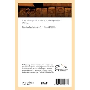 Essai historique sur le cidre et le poiré / par Louis Duval,...Date de l'édition originale : 1896Sujet de l'ouvrage : Cidre -- HistoirePoiré (boisson) -- HistoireLe présent ouvrage s'inscrit dans une politique de conservation patrimoniale des ouvrages de la littérature Française mise en place avec la BNF.HACHETTE LIVRE et la BNF proposent ainsi un catalogue de titres indisponibles, la BNF ayant numérisé ces œuvres et HACHETTE LIVRE les imprimant à la demande.Certains de ces ouvrages reflètent des courants de pensée caractéristiques de leur époque, mais qui seraient aujourd'hui jugés condamnables.Ils n'en appartiennent pas moins à l'histoire des idées en France et sont susceptibles de présenter un intérêt scientifique ou historique.Le sens de notre démarche éditoriale consiste ainsi à permettre l'accès à ces œuvres sans pour autant que nous en cautionnions en aucune façon le contenu.Pour plus d'informations, rendez-vous sur www.hachettebnf.fr