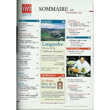 132p. ; couverture couleur, photos n&b et couleur à l'intérieur ; in-4 (29x22cm), dos carré. ARTICLES sur : Les 183 meilleurs languedocs - Vins du Nouveau Monde - Salon des vignerons indépendants - Margaux 1985 & 1990 - Rhums de la Martinique - Condrieu - Saint-Bris - Marc Ragaine -... SOMMAIRE en photo (cliquer sur l'image pour zoomer et pouvoir lire correctement les titres).