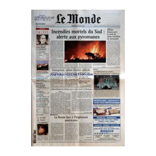 CAHIER - DE L'ETE - SEULS CONTRE TOUS - LOUISE MICHEL LA COMBATTANTE - ELLE A ETE DE TOUTES LES BATAILLES CONTRE L'AUTORITE - JEU D'ENFANT - METEO - JEU-CONCOURS - BALADES EN PROVENCE - AUTOUR DE BANDOL - LE TERROIR OU LE VIN EST ROI - AFFAIRE DAVID KELLY - LA GUERRE ENTRE LA BBC ET TONY BLAIR - EDUCATION - 4000 ASSISTANTS POUR REMPLACER LES EMPLOIS-JEUNES - ITALIE - LES CENTRISTES CONTRE BERLUSCONI - DISPARITION - BOB HOPE, 100 ANS - COLLINES DE LEGENDE - VAUQUOIS, 14000 MORTS ENTRE 1914 ET 1918 - ART CONTEMPORAIN - CHRISTIAN BERNARD AU MUSEE DE GENEVE - INCENDIES MORTELS DU SUD - ALERTE AUX PYROMANES - AFFAIRE BETANCOURT - LE RECIT DU PILOTE BRESILIEN EN AMAZONIE - ENTREPRISES - DEBUT D'ANNEE DIFFICILE - HANDICAPEES PAR LA HAUSSE DE L'EURO - LES ETATS-UNIS EN MEILLEURE POSITION - RENAULT S'EN SORT GRACE A NISSAN - FESTIVAL - 'L'ENLEVEMENT AU SERAIL+« MOZART CARNAVALESQUE A SALZBOURG - L'HOTEL MOSKVA DE STALINE RASE ET RECONSTRUIT A L'IDENTIQUE PAR MARIE-PIERRE SUBTIL - FAIT DIVERS - LE DRAME DE MARIE TRINTIGNANT - ANALYSE - LA RUSSIE FACE A L'HEGEMONIE AMERICAINE PAR DANIEL VERNET.