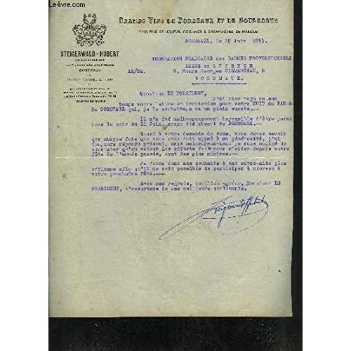 R300193335. UNE LETTRE DACTYLOGRAPHIEE SIGNEE DE STEIGERWALD-HUBERT GRANDS VINS DE BORDEAUX ET DE BOURGOGNE - DATANT DE 1953 - DESTINEE A LA FEDERATION FRANCAISE DES BARMEN PROFESSIONNELS.. 1953. In-4. En feuillets. Bon état, Couv. convenable, Dos satisfaisant, Intérieur frais. UNE LETTRE DACTYLOGRAPHIEE SIGNEE DE UNE PAGE DE STEIGERWALD-HUBERT GRANDS VINS DE BORDEAUX ET DE BOURGOGNE - DATANT DE 1953 - DESTINEE A LA FEDERATION FRANCAISE DES BARMEN PROFESSIONNELS.. . . . Classification Dewey : 908.447-Régionalisme : Aquitaine